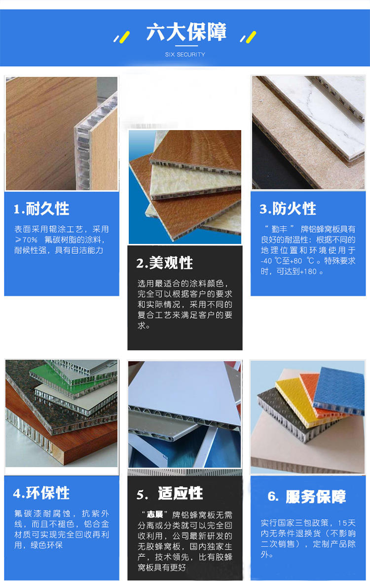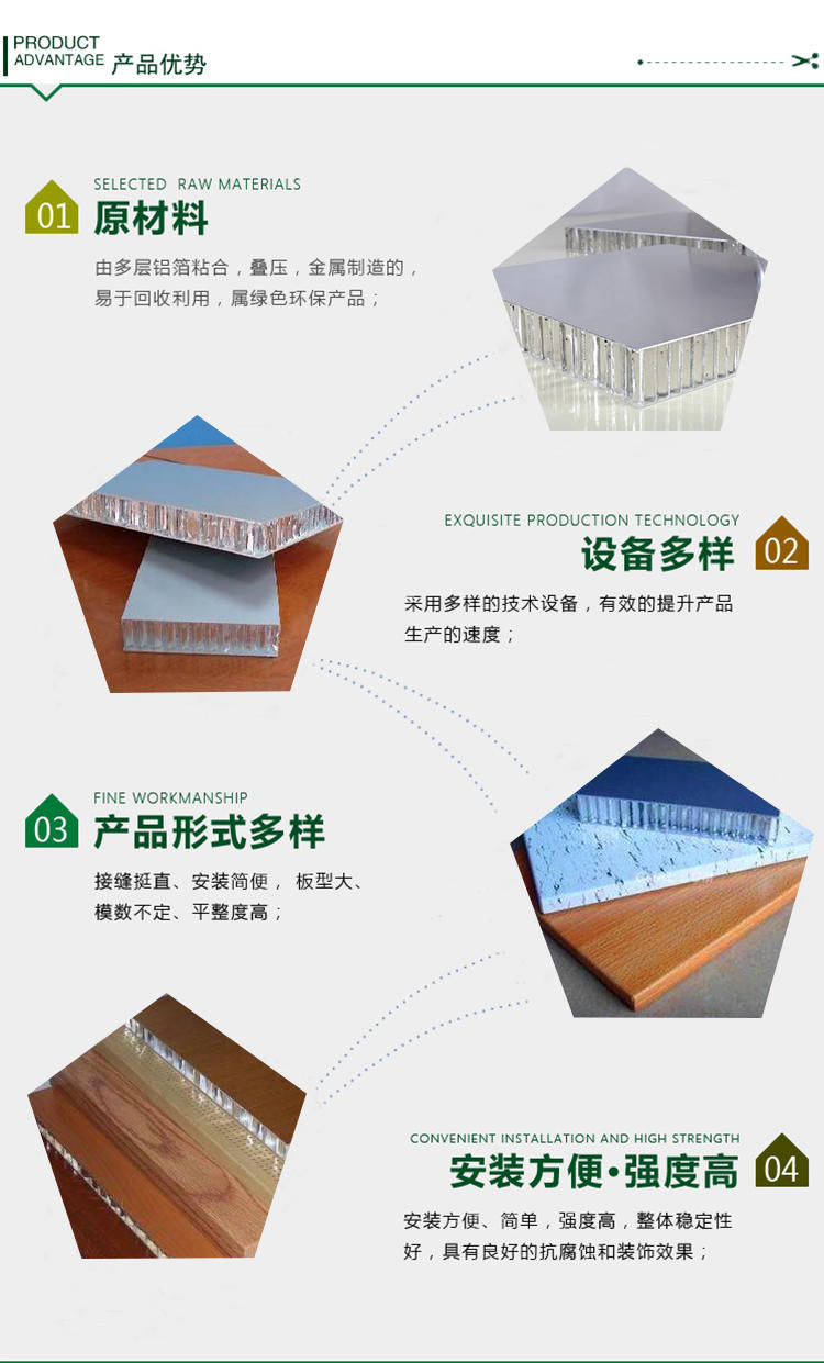 表(biao)面(mian)經耐(nai)腐蝕力極(ji)強(qiang)(qiang)的(de)(de)氟(fu)碳樹脂處(chu)理(li)后,使之可廣泛應(ying)用于大(da)(da)(da)廈的(de)(de)惟幕墻(qiang)、屋(wu)頂、大(da)(da)(da)型門面(mian)招牌及(ji)內墻(qiang)等(deng)的(de)(de)裝飾。 鋁(lv)蜂(feng)(feng)窩(wo)板正(zheng)面(mian)鋁(lv)板采(cai)用符合 E. C. C. A. 質量標(biao)準(zhun)的(de)(de) PVDF 氟(fu)碳烤漆,分為普通(tong)色和金屬色。因此(ci)表(biao)面(mian)同樣具有優異的(de)(de)耐(nai)候(hou)性能(neng)。追隨自(zi)然(ran)(ran)產(chan)品的(de)(de)創(chuang)新(xin)往(wang)往(wang)要(yao)模仿大(da)(da)(da)自(zi)然(ran)(ran)的(de)(de)結構(gou)和形式(shi),人類的(de)(de)發明創(chuang)造無不(bu)受到大(da)(da)(da)自(zi)然(ran)(ran)的(de)(de)啟(qi)發,并適(shi)應(ying)自(zi)然(ran)(ran)界的(de)(de)要(yao)求。鋁(lv)蜂(feng)(feng)窩(wo)板以其質輕、強(qiang)(qiang)度高、剛(gang)度大(da)(da)(da)等(deng)諸(zhu)多(duo)優點,已(yi)被廣泛應(ying)用于大(da)(da)(da)廈外墻(qiang)裝飾。