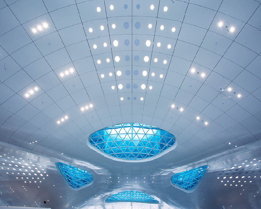荊州機場航站樓造型為一朵盛開的荷花,特別是航站樓大廳穹頂的白蓮花造型吊頂板,需要在超大的延展面內完成雙曲板的密拼,工程難度極具挑戰性!